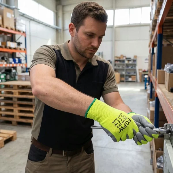 Kraftigt fluorescerende stof gør håndpositioner tydelige i dunkle omgivelser. Holdet opfatter signaler med det samme, hvilket hjælper med at undgå farlige fejl omkring maskiner.