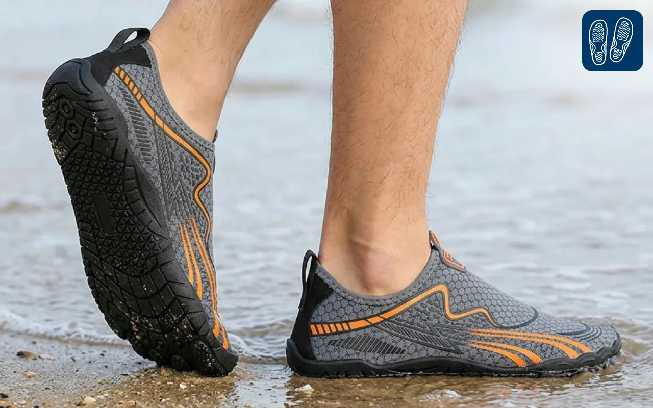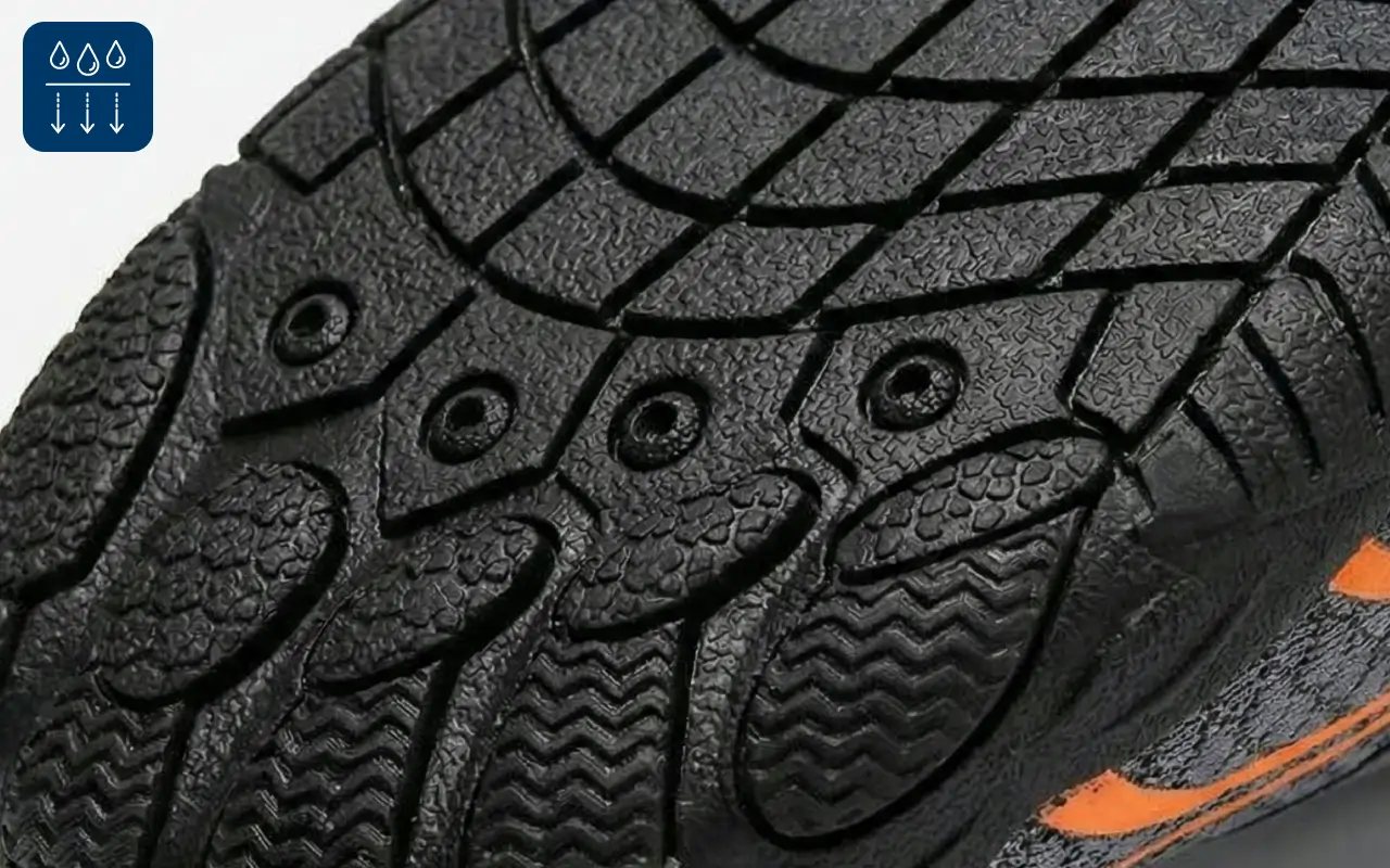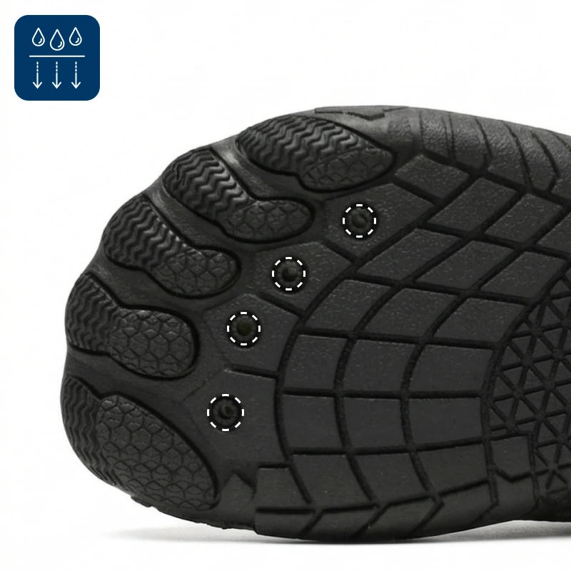 Unik femtået sål giver stabilitet på vådt eller ujævnt underlag. Du står sikkert under sport, på strande eller ved flodbredder.