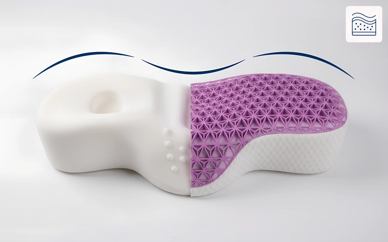 Dette design fremmer korrekt positionering for en rolig nat. Det hjælper med at reducere smerter ved at støtte de naturlige kurver.