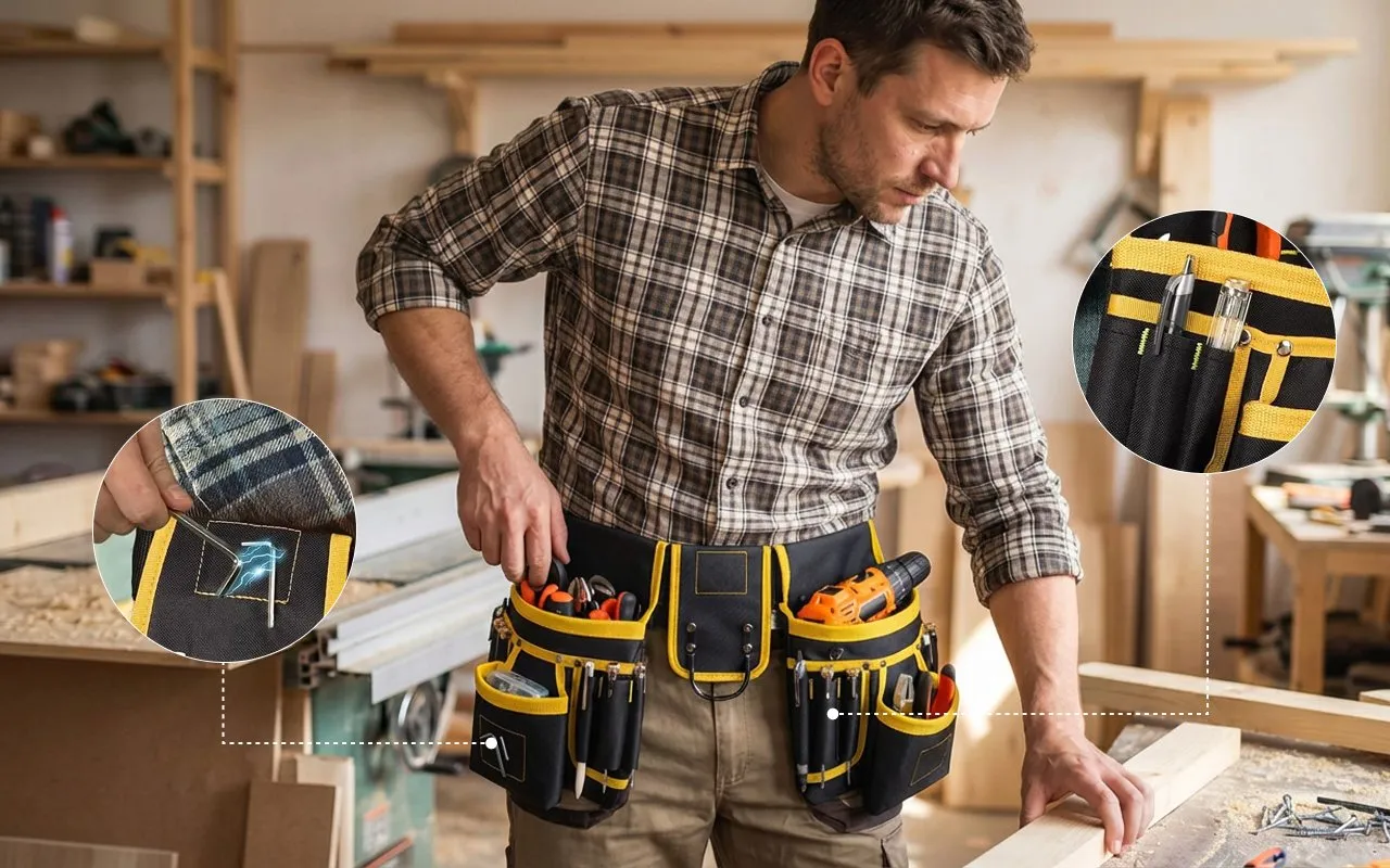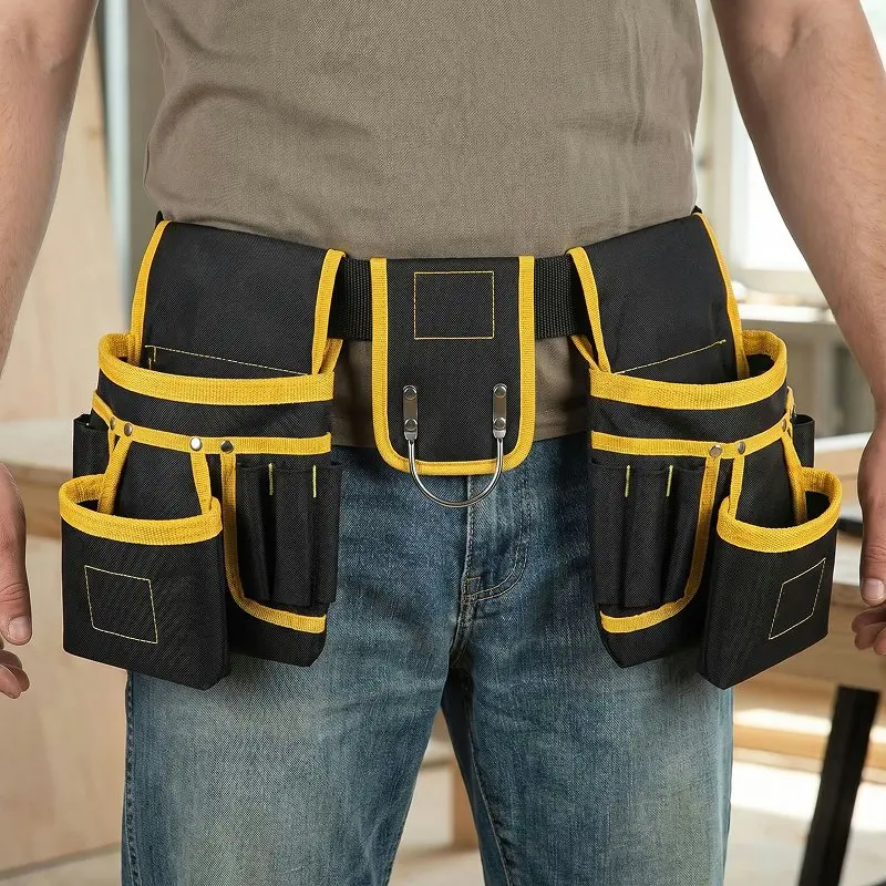 Jeg bruger bæltet til tømrerarbejde i min garage. Vægten sidder godt på hofterne, og lommerne holder søm adskilt fra små værktøjer.