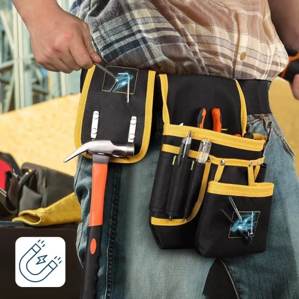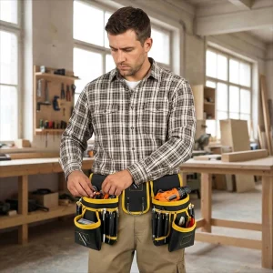 Jeg bærer denne taske på lange vagter, når jeg trækker kabler i huse. Det polstrede bælte skåner mine hofter, og jeg kan tage tape, tænger og skruer uden at kigge ned.