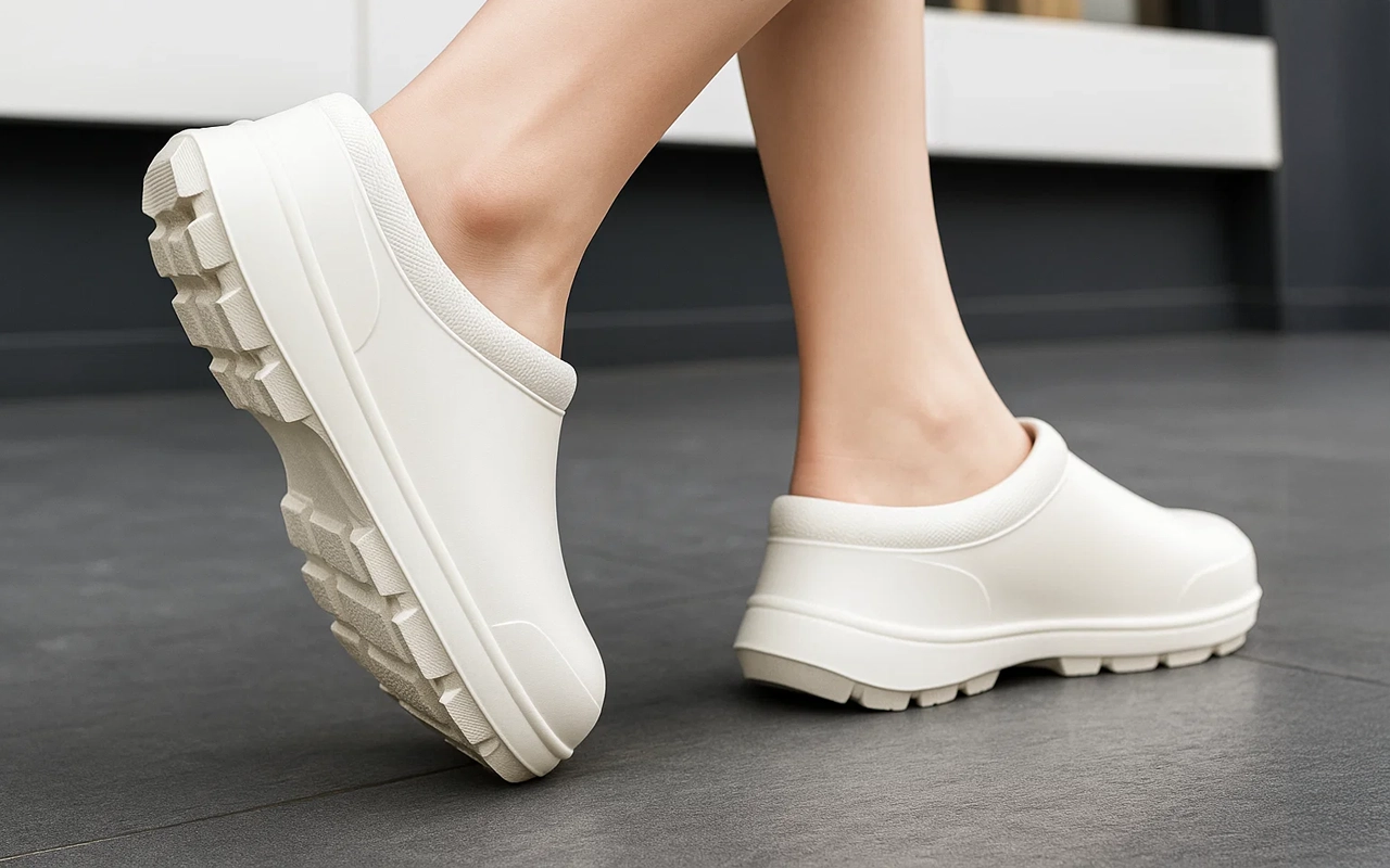 De bedste køkkensko jeg har haft—ingen ømme ankler, nemme at skylle rene, og de føles aldrig tunge. Elsker hvor hurtigt jeg kan bevæge mig i dem.