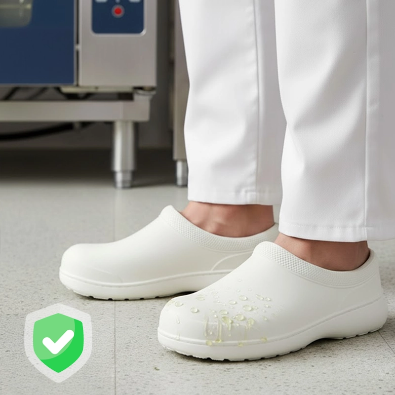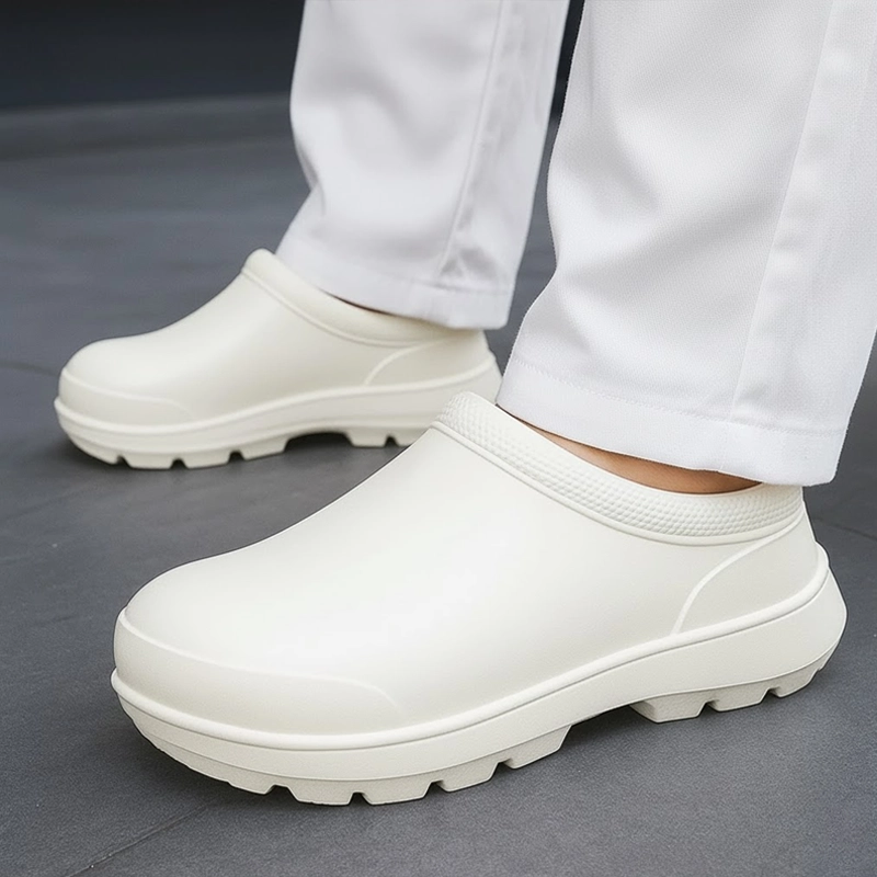 De bedste køkkensko jeg har haft—ingen ømme ankler, nemme at skylle rene, og de føles aldrig tunge. Elsker hvor hurtigt jeg kan bevæge mig i dem.