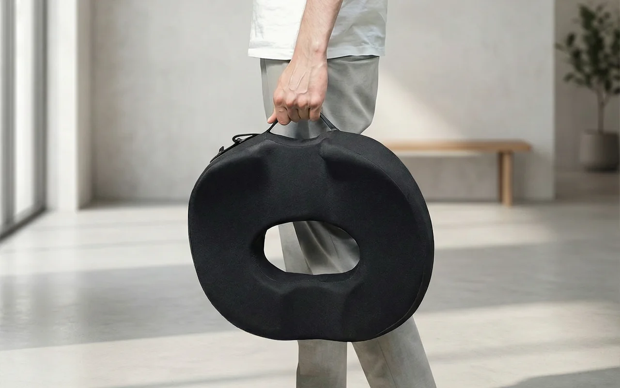 Let bærehåndtag og krog gør det nemt at tage komforten med overalt. Brug Ortorex sædepude derhjemme, på kontoret eller under rejser.