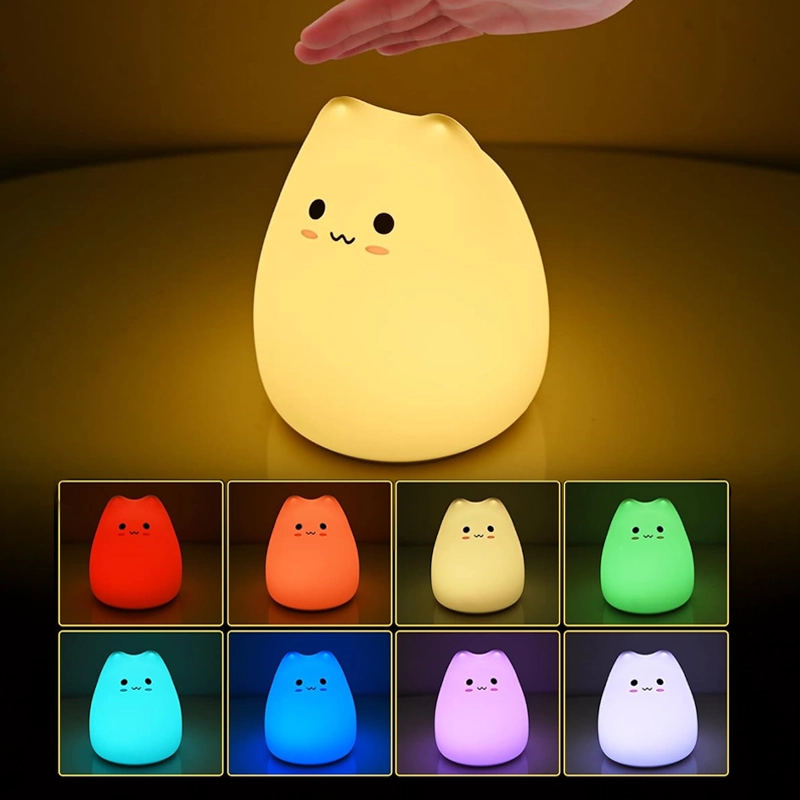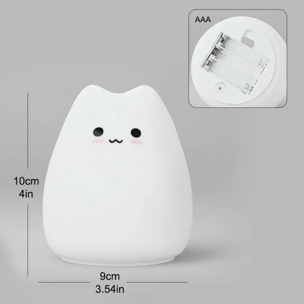 Købte denne søde kat-lampe til min datter. Hun trykker selv på den ved sengetid, vælger en farve og falder nu meget hurtigere til ro.