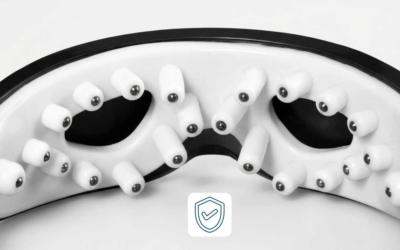 Kraftige vibrationer løsner spændinger omkring øjnene. Føl dig nemt frisk igen efter læsning, skærmtid eller studier.