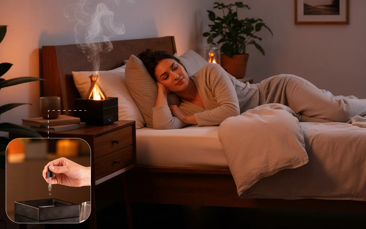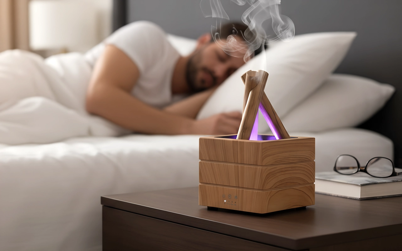 Vi har bål-aroma-diffuseren i soveværelset. Den hjælper min mand med at sove roligt. Timeren gør, at jeg kan indstille den og ikke tænke på at slukke den.