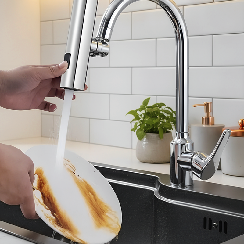 Den brede stråle hjælper med at skylle mine store tallerkener, mens den kraftige stråle er god til det hårde snavs. Den bliver siddende, lækker ikke og er super praktisk!