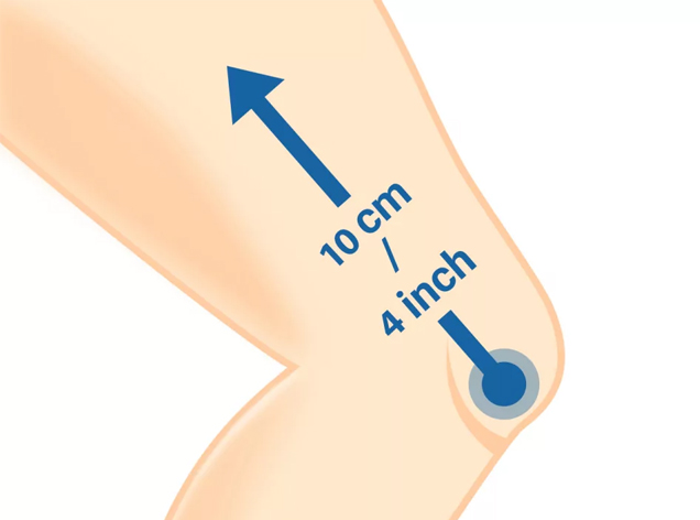 - 2. Vikl målebåndet rundt om den bredeste del af låret cirka 10 cm/4" over midten af knæskallen.