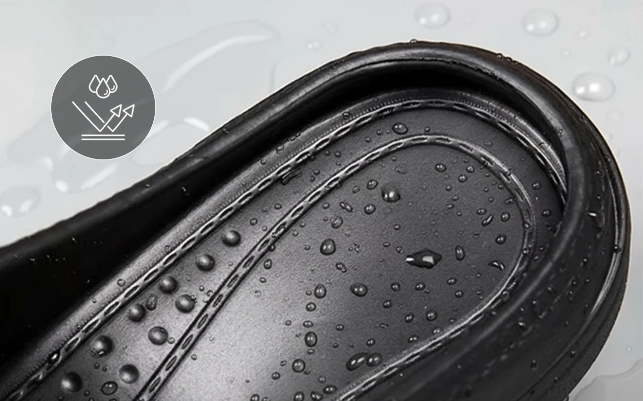 Prøvede dem i mit køkkenjob—ingen glid eller våde strømper hele vagten. Behagelige at gå i og hurtige at tage på. De ser også smarte ud.