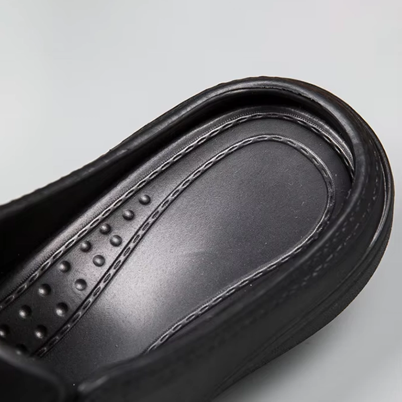 Prøvede dem i mit køkkenjob—ingen glid eller våde strømper hele vagten. Behagelige at gå i og hurtige at tage på. De ser også smarte ud.