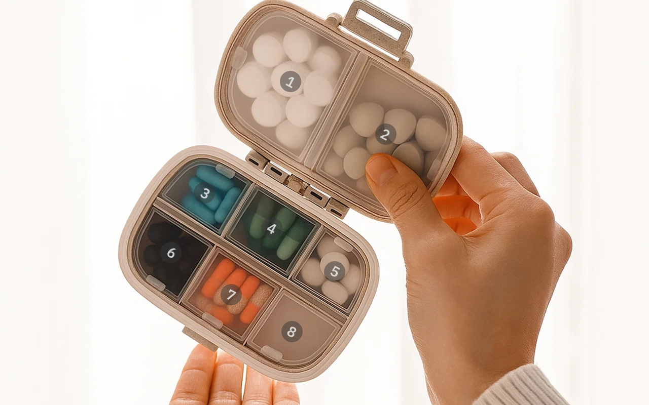 Du kan sort dine doser efter dag eller type, så intet bliver blandet sammen. Hvert rum åbnes separat, hvilket gør det nemt hurtigt at tage det, du har brug for.
