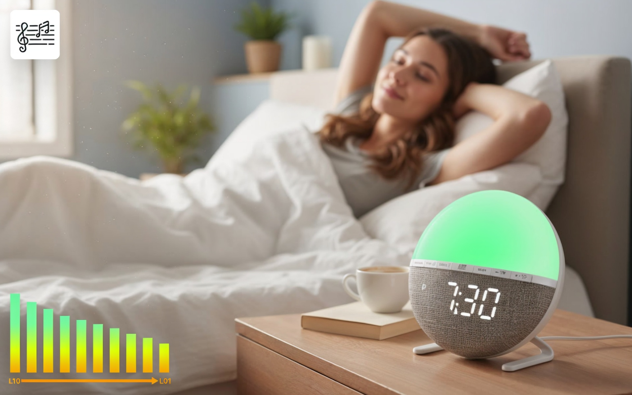 Vælg mellem syv afslappende lyde eller kun solopgangslys. Ti lydniveauer sikrer, at alle finder deres perfekte morgenrutine.