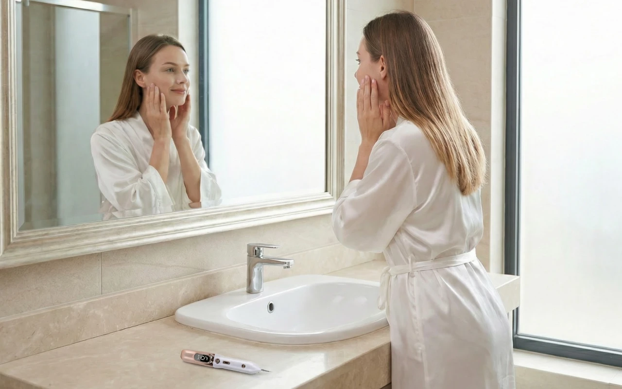 Elektrisk ionteknologi rammer mærker, mens sunde områder beskyttes. Helingen er skånsom og undgår skrappe kemikalier eller risici.