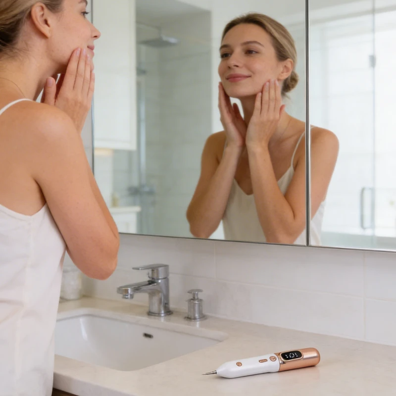 Jeg prøvede denne Mole Pen efter at have været nervøs for at gå til en klinik. Den virkede fantastisk! Pletterne forsvandt på cirka en uge, og det gjorde slet ikke ondt.