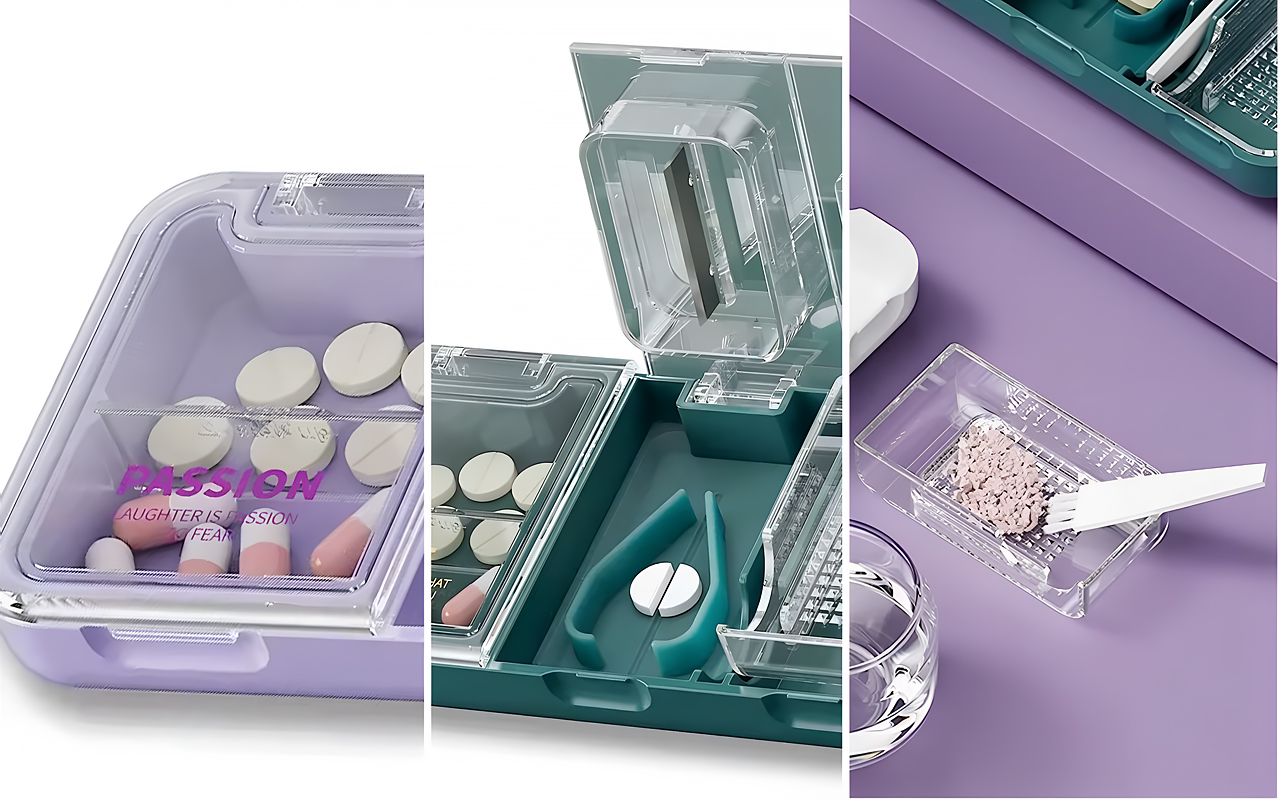 Tre nøglefunktioner er samlet i én enkel enhed. Opbevar, del og knus tabletter uden besvær eller rod.