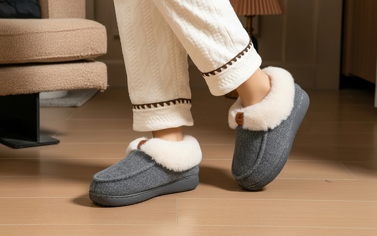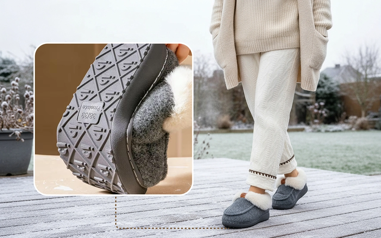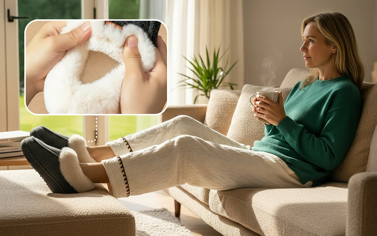 Tykt plysbetræk omfavner dine fødder med blød komfort. Perfekte til kolde morgener eller afslapning indendørs efter arbejde.
