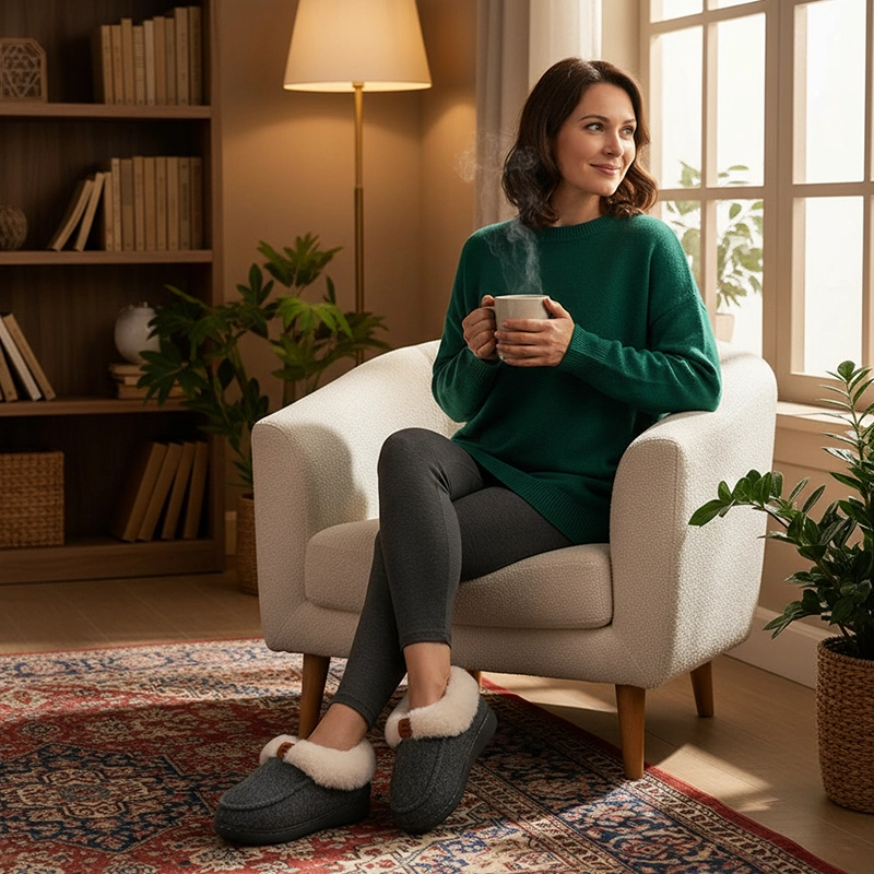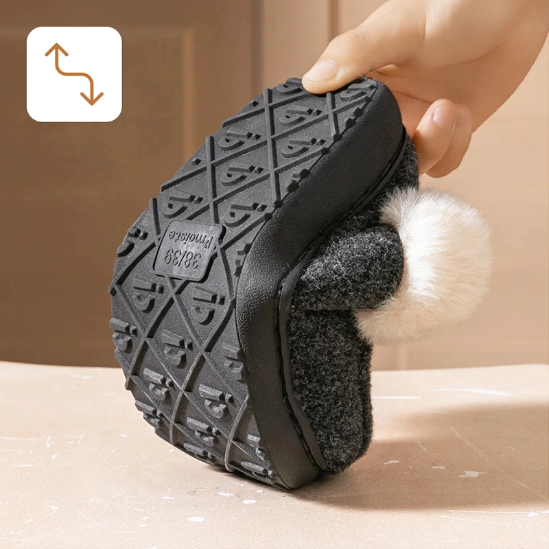 Tykt plysbetræk omfavner dine fødder med blød komfort. Perfekte til kolde morgener eller afslapning indendørs efter arbejde.