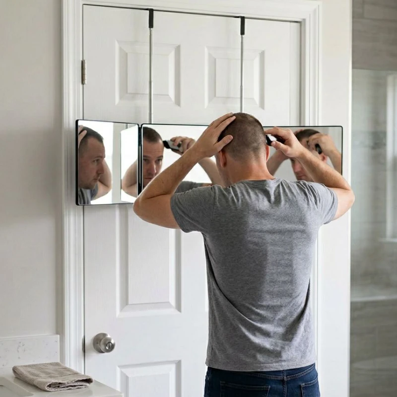 Det tre-sidede spejl gør det meget lettere for mig at trimme mit skæg. Jeg kan endelig se bagsiden af mit hoved uden at skulle vride mig rundt.