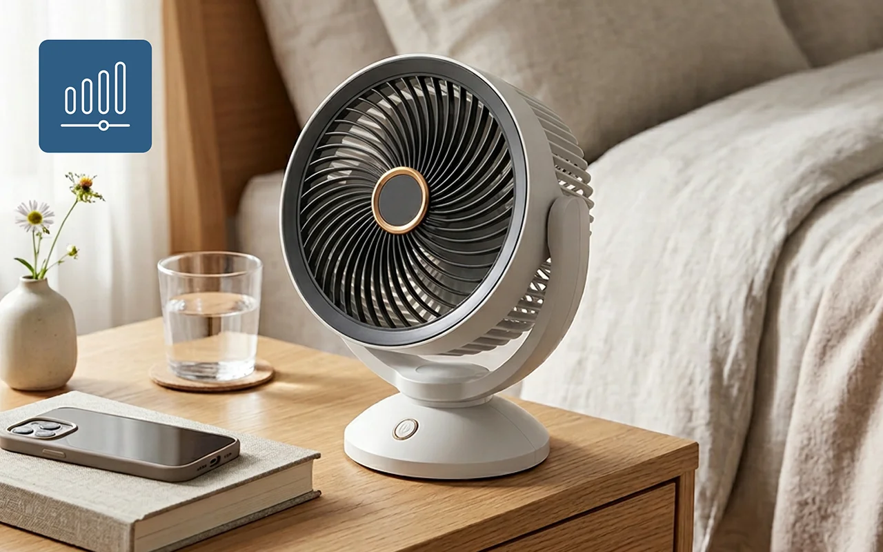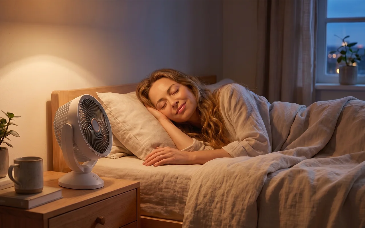 Lav lyd understøtter dybere søvn gennem varme aftener. Blid luftstrøm reducerer indelukkethed og hjælper sindet med at falde til ro hurtigere.