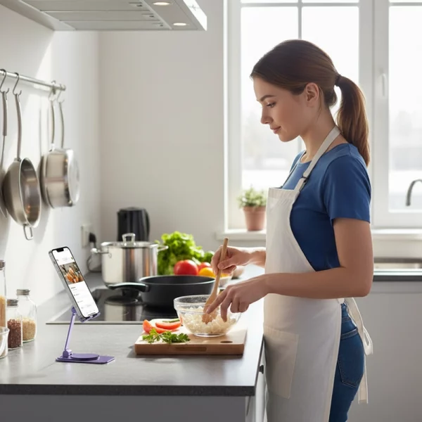 Jeg har dette stativ stående på min køkkenbordplade til opskrifter og videoopkald, mens jeg laver mad. Det vipper glat og frigør hele min arbejdsplads.