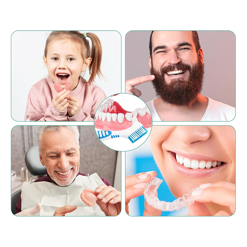 Bløde nylonbørster beskytter sarte dele uden at ridse eller beskadige dem. Din tandprotese får en grundig rengøring, så den ser ud som ny.