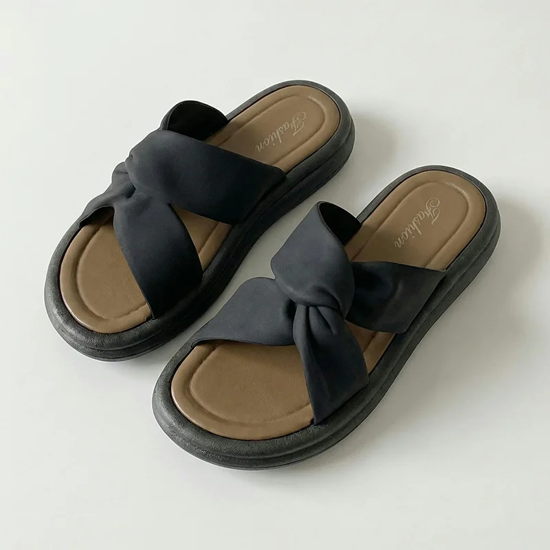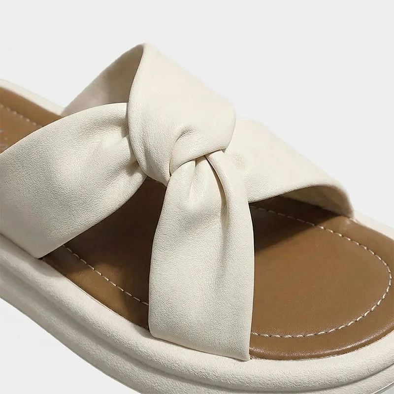Jeg har følsomme fødder, men disse sandaler føles skånsomme og støttende. Remmene skærer ikke, og den knudede overdel får selv enkle outfits til at virke gennemførte.