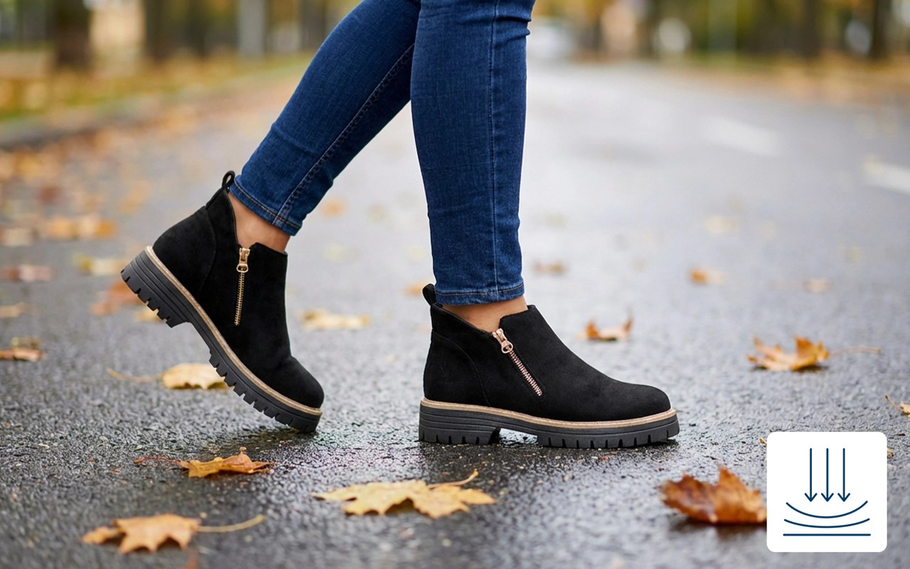 Bevæg dig trygt på våde stier eller glatte gulve hver dag. Den tykke sål forhindrer at du glider og giver dig ekstra selvtillid.