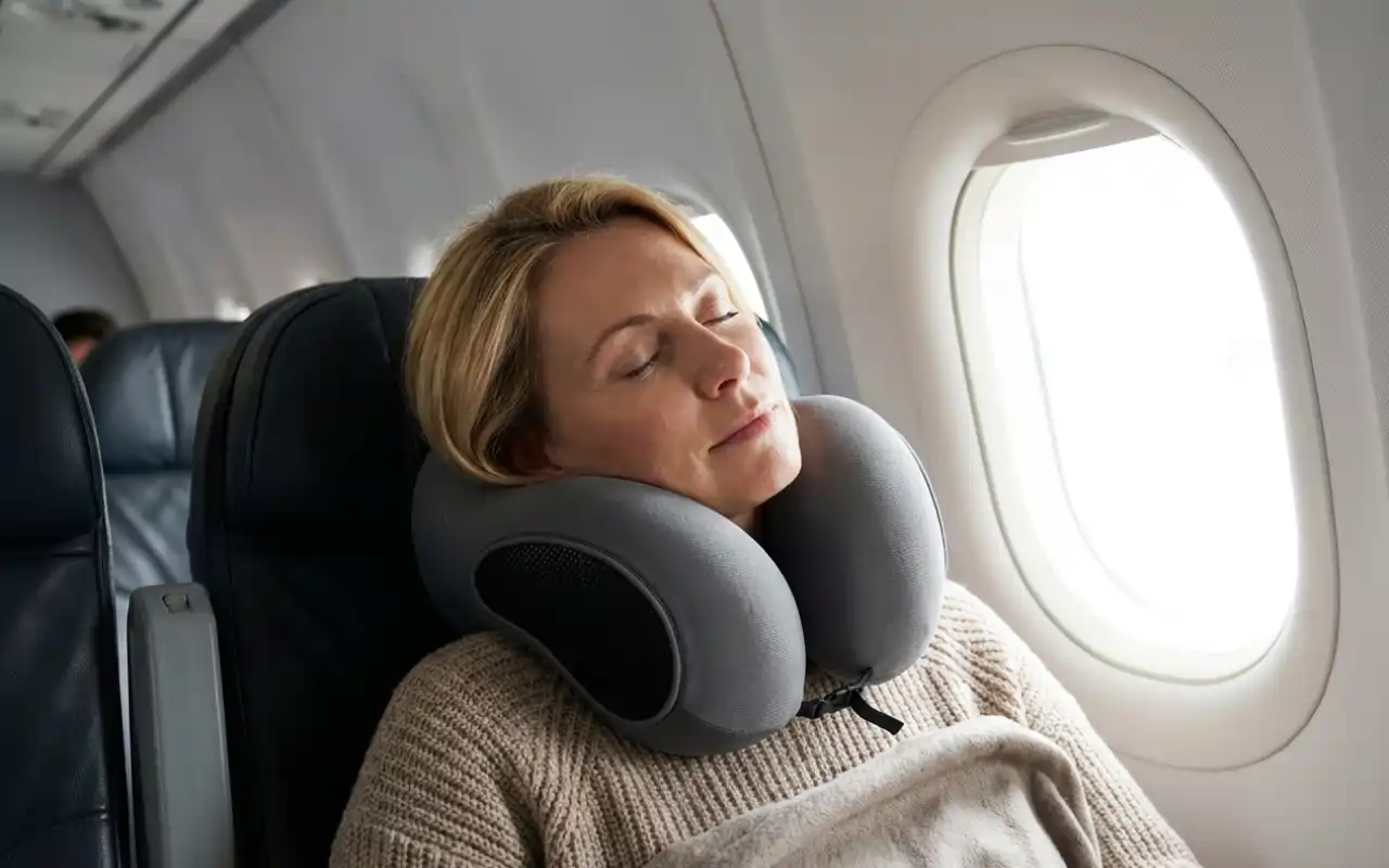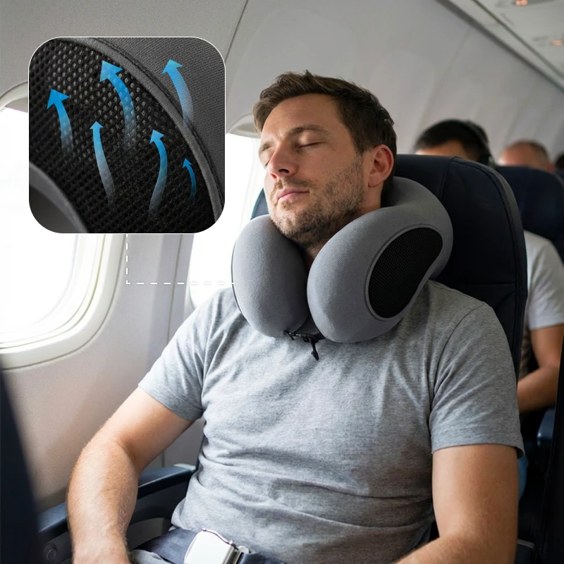 Jeg får hovedpine i flyet, men ikke længere! Nakkepuden støtter mit hoved, så jeg vågner op og har det godt hver gang.