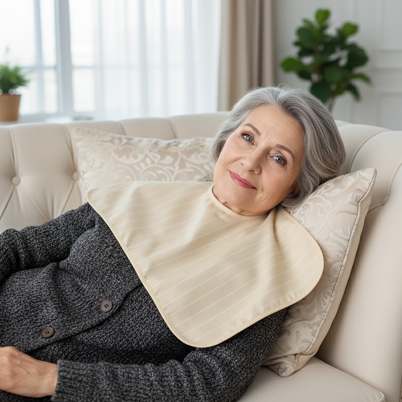 Dette hagesmæk holder mine skjorter tørre og uden pletter, når jeg spiser suppe. Den føles blød mod min hals og bliver aldrig irriterende, selv efter flere timer.