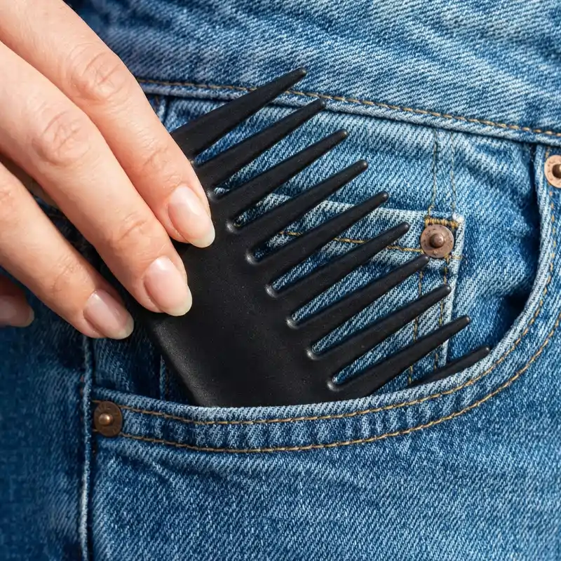 Jeg har altid denne lomme kam med mig nu. Den passer direkte ned i mine jeans og klarer knuder uden at hive. Super blid og filtrer aldrig mine krøller!