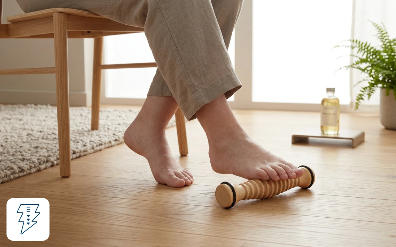 Ret hurtigt mod stramme områder for en mærkbar lindring med det samme. Regelmæssig brug hjælper med at reducere smerter fra hælspore (plantar fasciitis) og daglig belastning.