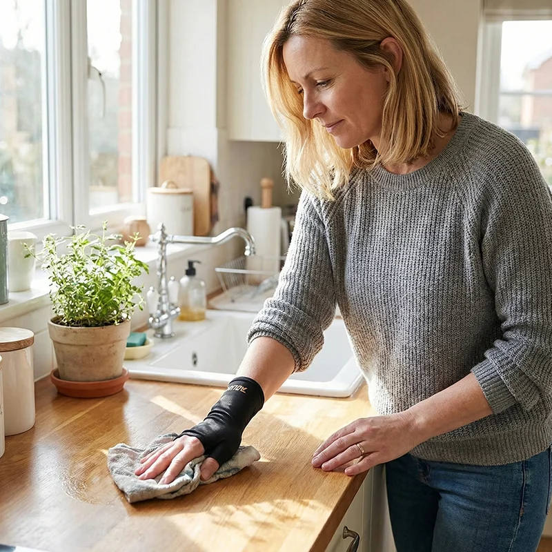 Åndbart, elastisk stof omslutter din hånd blidt for komfort hele dagen. Ingen klemning eller gliden, så du får jævn støtte under hele brugen.